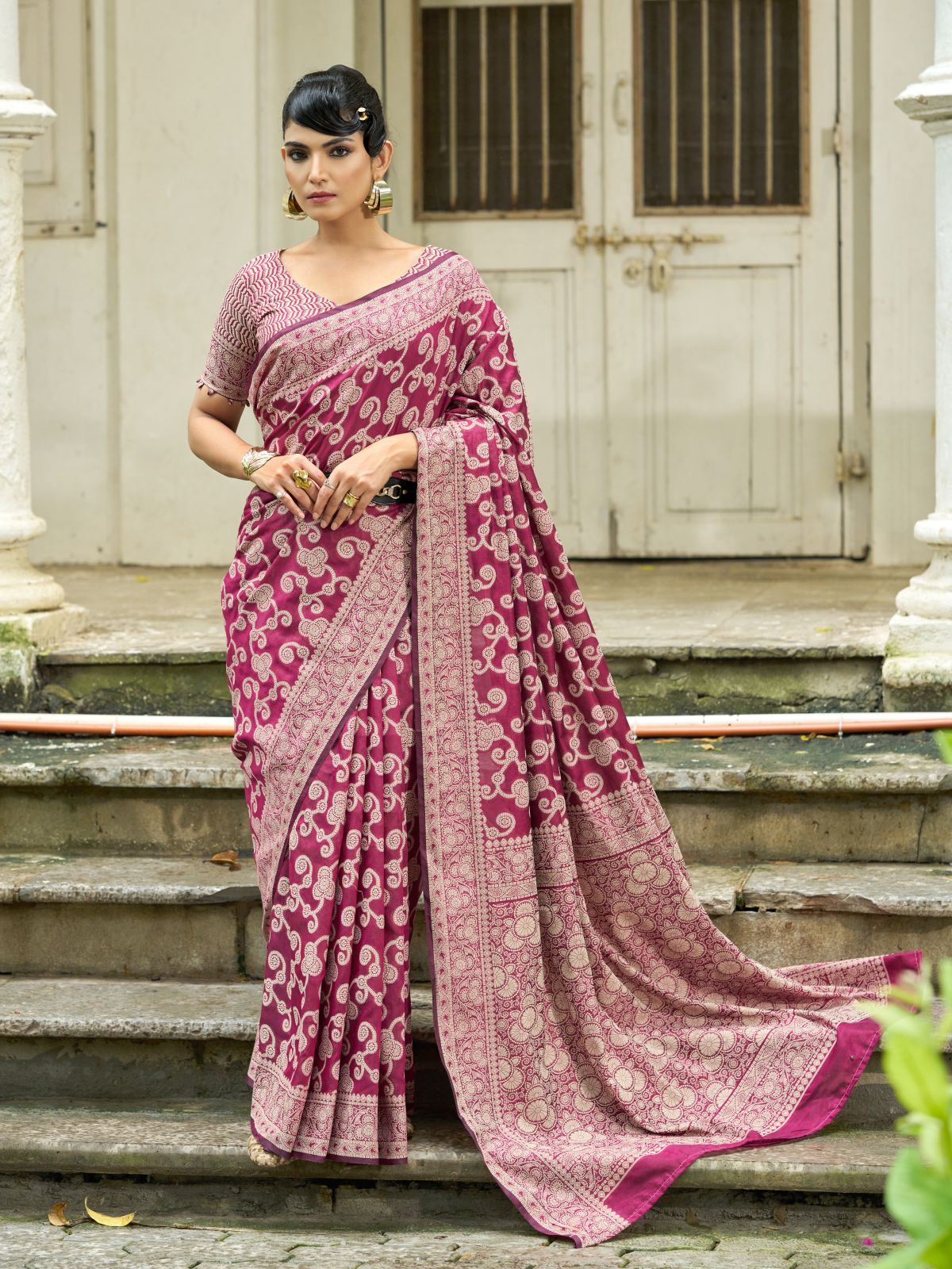 We offer exquisite Ladies Wine Cotton Luckhanvi Sarees, crafted with premium Cotton Luckhanvi material in a rich wine color. These 6.30 length sarees feature a beautiful weaving print pattern, perfect for all occasions. Easy to wear and boasting a stylish weaving design, they come with an unstitched blouse. Custom packaging available as per customer preference. Ideal for Manufacturer, Exporter, Supplier, and Trader businesses looking to provide high-quality ethnic wear options.